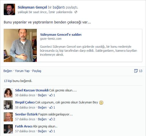 Olayın Gaze-temiz.com ofisinin olduğu binada gerçekleştiğini söyleyen Gençel, “Saat 15.30 sıralarında üç kişi geldiler. Ama ofis kalabalıktı, içeri giremediler. Ben de biraz şüphelendim açıkçası, kimi aradıklarını sormak için dışarı çıktım. Ancak birden bire etrafımı sarıp, saldırdılar. Birkaç darbeden sonra ofise kaçmayı başardım. Onlarda merdivenden inerek kayboldular” ifadelerini kullandı.