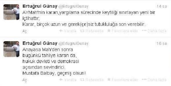 Kültür ve Turizm eski Bakanı Ertuğrul Günay, “Anayasa Mahkamesi'nden sonra bugünkü tahliye kararı da hukuk devleti ve demokrasi açısından sevindirici. Mustafa Balbay geçmiş olsun. Anayasa Mahkemesi'nin kararı, yargılama sürecinde keyfiliği sınırlayan yeni bir içtihattır. Karar, birçok uzun ve gerek(çe)siz tutukluluğa son verebilir” diye yazdı.