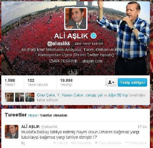 AK Parti İzmir Milletvekili Ali Aşlık, imalı mesajında “Mustafa Balbay tahliye edilmiş, hayırlı olsun. Umarım bağımsız yargı tutuklayıp, bağımsız yargı tahliye etmiştir" diye yazdı.