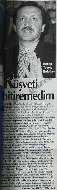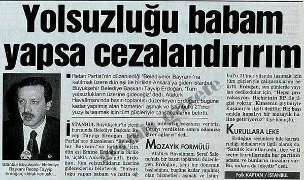 Bununla birlikte; 3 Nisan 1994’teki Hürriyet’in haberine göre; Erdoğan yolsuzlukların üzerine gideceğini belirterek, “yolsuzluğu babam yapsa cezalandırırım” diye söylemiş.Yine Erdoğan 3 Temmuz 1998’deki Hürriyet haberine göre; "Belediyede rüşveti bitiremediğini" belirtmiş.