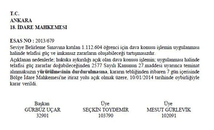 Öte yandan, 08 Haziran 2013 tarihinde yapılan ve sonuçları doğru hesaplanmayan Seviye Belirleme Sınavına katılan 1.112.604 öğrenci için dava konusu işlemin uygulanması halinde telafisi güç ve imkansız zararların oluşabileceği tartışmasızdır. Açıklanan nedenlerle; hukuka aykırılığı açık olan dava konusu işlemin; uygulanması halinde telafisi güç zararlar doğabileceğinden 2577 Sayılı Kanunun 27.maddesi uyarınca teminat alınmaksızın yürütülmesinin durdurulmasına, kararın tebliğinden itibaren 7 gün içerisinde Bölge İdare Mahkemesi’ne itiraz yolu açık olmak üzere, 10/01/2014 tarihinde oybirliğiyle karar verildi” denildi.