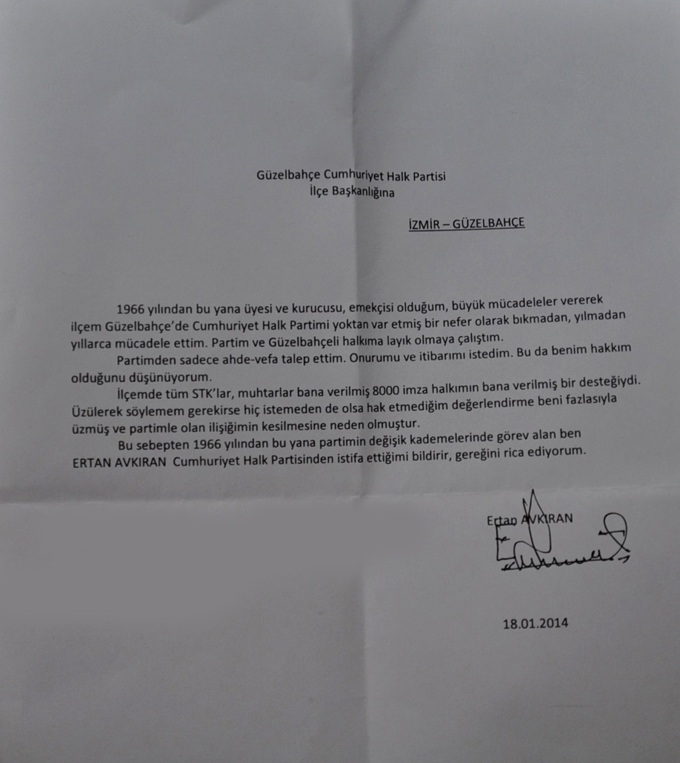 Güzelbahçe Belediye eski Başkanı Ertan Avkıran, beraberindeki 44 kişiyle birlikte CHP’den istifa etti. 100 kişilik bir grupla ofisinde basın açıklaması gerçekleştiren Avkıran sert sözlerle hem Genel Merkeze hem de İl ile ilçe başkanlığına yüklendi. Toplantı öncesinde ofis duvarlarında bulunan CHP’ye ait fotoğrafların kaldırılması dikkat çekerken, CHP Güzelbahçe İlçe Başkanlığı’nın dış cephesine Mustafa İnce’nin afişlerinin asıldığı görüldü.