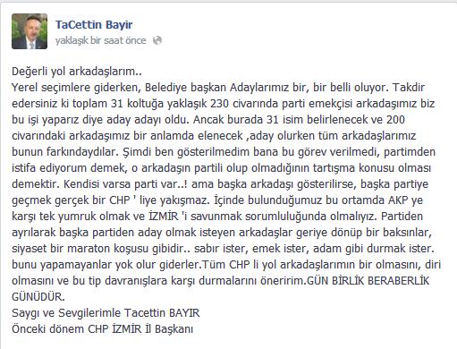 Öte yandan kişisel Facebook hesabı üzerinden de bir açıklama yapan Bayır açıklamasında, “Takdir edersiniz ki toplam 31 koltuğa yaklaşık 230 civarında parti emekçisi arkadaşımız biz bu işi yaparız diye aday adayı oldu. Ancak burada 31 isim belirlenecek ve 200 civarındaki arkadaşımız bir anlamda elenecek, aday olurken tüm arkadaşlarımız bunun farkındaydılar. Şimdi ben gösterilmedim bana bu görev verilmedi, partimden istifa ediyorum demek, o arkadaşın partili olup olmadığının tartışma konusu olması demektir” ifadelerini kullandı.