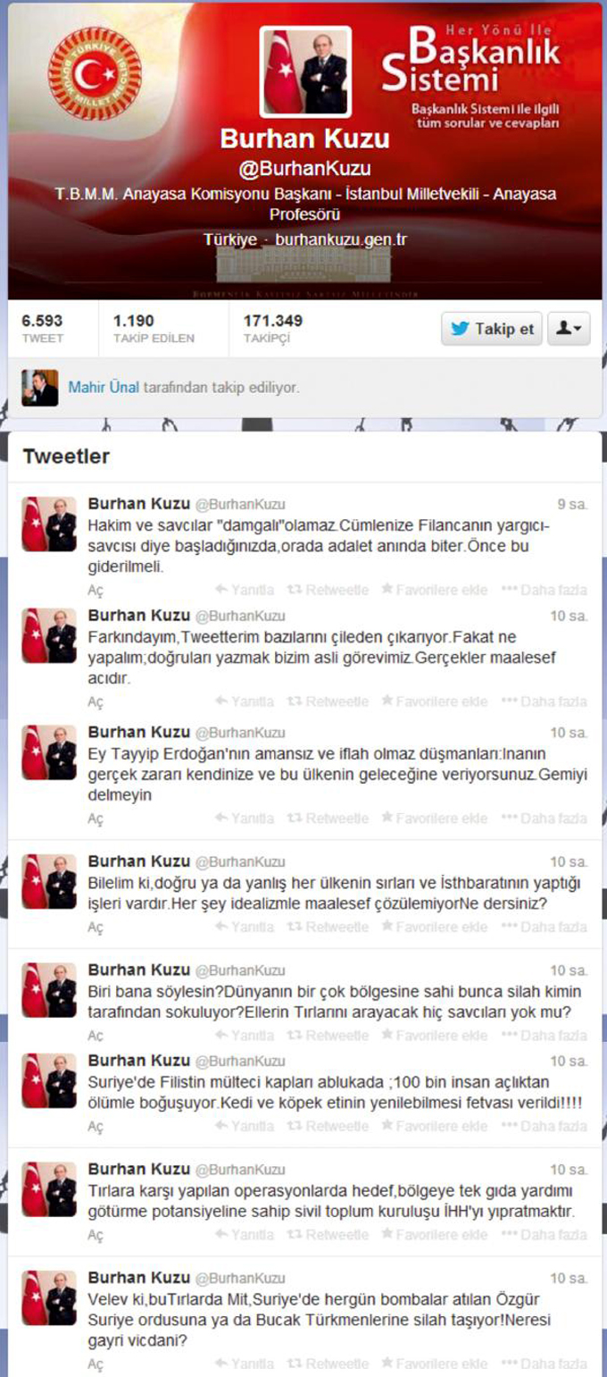 TBMM ANAYASA Komisyonu Başkanı ve AK Parti İstanbul Milletvekili Burhan Kuzu, silah yüklü TIR'larla ilgili Twitte, "Velev ki bu TIR'larda MİT, Suriye'de her gün bombalar atılan Özgür Suriye ordusuna, ya da Bucak Türkmenlerine silah taşıyor! Neresi gayrı vicdani?" dedi.