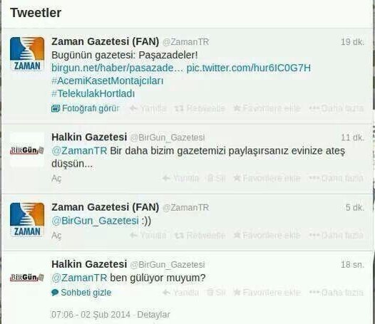 'Zaman' gazetesinin Twitter'daki fan sayfası BirGün gazetesinin bugün 'Paşazadeler' manşetiyle çıkan haberini paylaştı. 'BirGün' gazetesinden ise 'bir daha bizim gazetemizi paylaşırsanız evinize ateş düşsün' şeklinde bir karşılık geldi.
