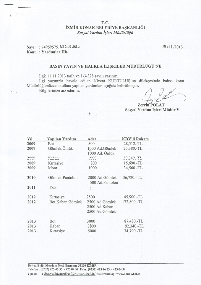 Konak Belediyesi, 2009 – 2013 yılları arasında Okullara bot, gömlek, önlük, kaban, kırtasiye dağıtmış.