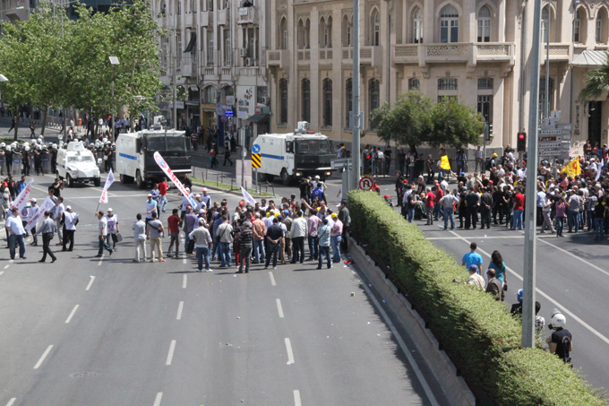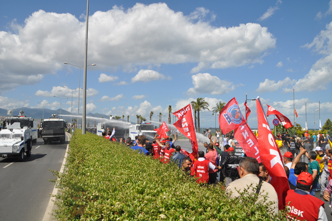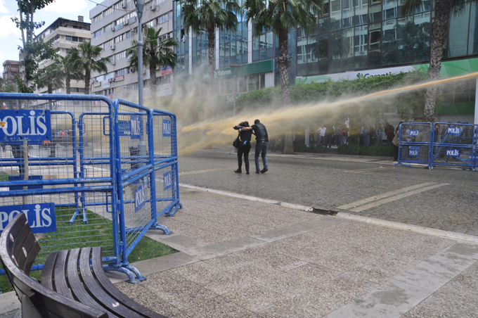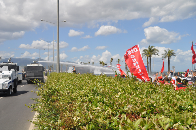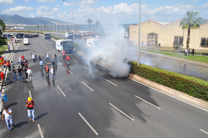 Alınan grev kararı çerçevesinde bugün sabah saatlerinde Basmane’de toplanarak Soma’nın yasını tutmak isteyen emekçiler, Konak Meydanı’na doğru yürüyüşe geçti. Polisin hazır bulunduğu Konak Meydanı’na vatandaşların yaklaşmasıyla birlikte tansiyon yükseldi. Protestoya katılanlar Konak Meydanı’nda polisin TOMA’lı müdahalesine maruz kaldı.