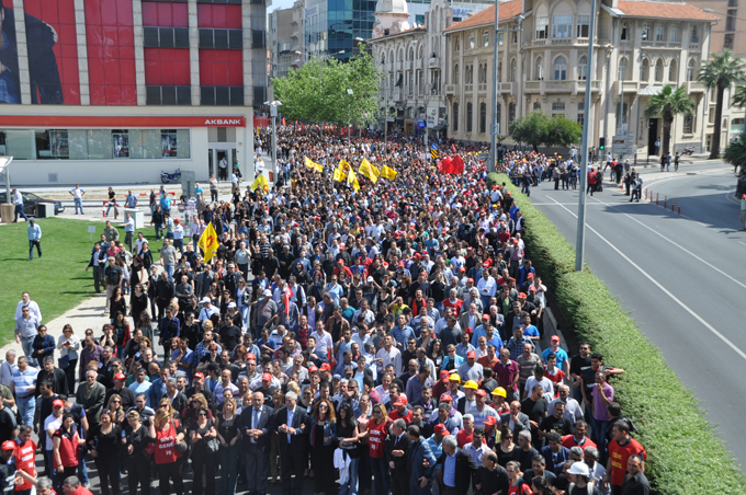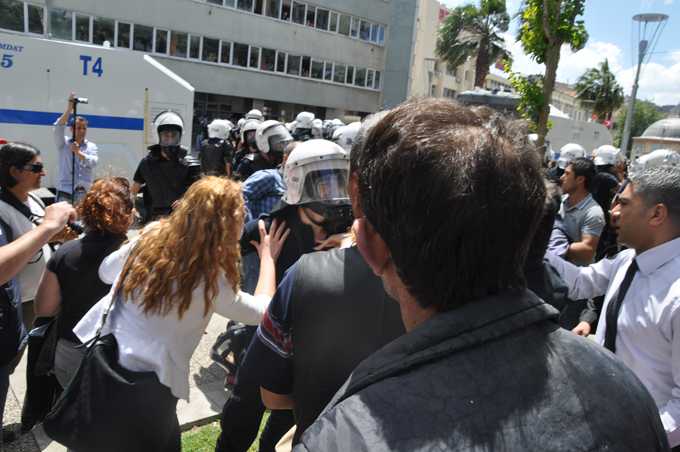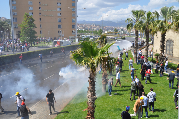 İzmir Büyükşehir Belediyesi önünde polis müdahalesi tüm şiddetiyle sürüyor. Eylemciler "kurtuluş yok tek başına, ya hep beraber ya hiç birimiz" , " katil polis" sloganları atıyor. Polisle eylemciler arasındaki çatışma sürüyor.