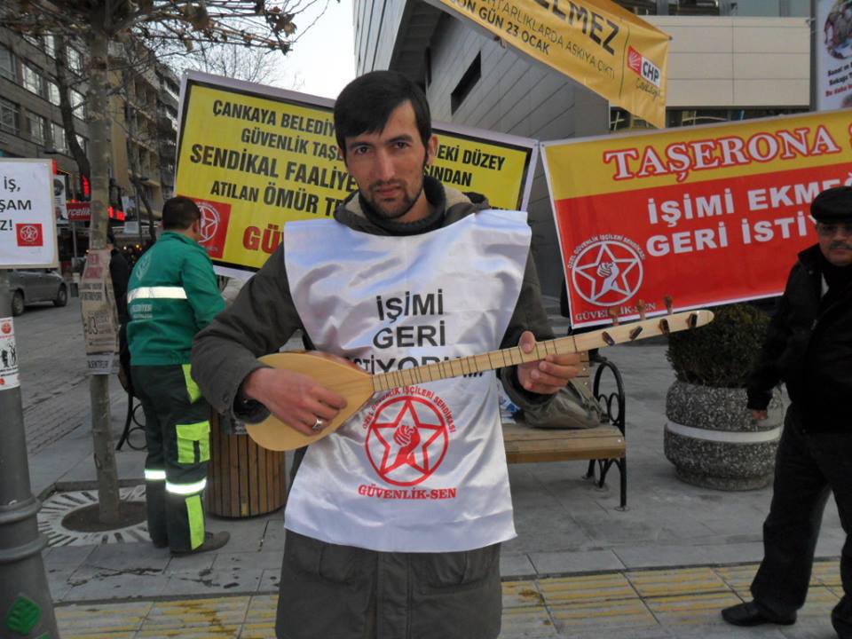 Ege'nin Sesi-Ulaş Üstündağ/Ankara’da Çankaya Belediyesi’ne koruma ve güvenlik hizmeti veren taşeron firmada çalışırken sendikal mücadele başlattığı için işinden olan Ömür Tekin yaklaşık 5aydan beri Çankaya Belediyesi önünde işine geri dönmek için direniyor. Sendikalı olmanın özel güvenlikler için anayasal hak olduğunu belirten Tekin mücadelesinde kararlı.Ege’nin Sesi Gazetesi olarak Ömür Tekin'le vermiş olduğu mücadeleyi konuştuk.