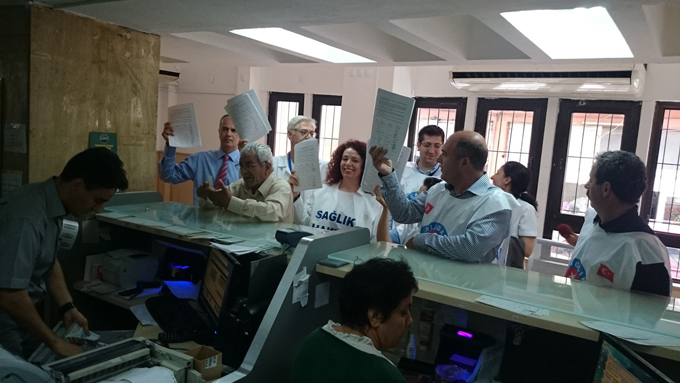Gazi Caddesinden PTT Yenişehir Şubesi’ne kadar yürüyüş yapan sağlık emekçileri yol boyunca attıkları sloganlarla ve taşıdıkları dövizlerle de hükümetin sağlık politikalarını protesto ettiler. GREV UYARISI İmzalar yollandıktan sonra sağlık çalışanları adına açıklama yapan SES İzmir Şube Başkanı Rukiye Çakır eylemler sonucunda herhangi bir gelişme olmadığını belirterek “Hastanede çalışanların, eylemleri gerekli sonuçları doğurmazsa hastaların hasta haklarını korumak için, güvenceyi sağlamak için üretimden gelen gücünü kullanacaklar. Basın önünde bunun duyurusunu yapıyoruz. Kararlılığımız ve eylemlerimiz devam edecek. ” dedi.