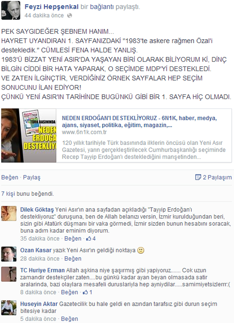 EGE’NİN SESİ- Gazeteci Feyzi Hepşenkal, Yeni Asır Gazetesi’nin bugün birinci sayfasında yer alan “120 Yıllık Demokratik Duruşa Devam” başlıklı Başbakan Recep Tayyip Erdoğan’ın Cumhurbaşkanı adaylığı yolunda destekçileri olduklarını belirtmelerinin ardından sosyal medya üzerinden bir açıklama yaptı. Gazetede söz konusu sayfada yer alan “1983'te askere rağmen Özal'i destekledik." Sözleri üzerinden Şebnem Bursalı’yı eleştiren Hepşenkal, o dönem kendisinin de Yeni Asır bünyesinde çalıştığını, Gazetenin Kurucularından Dinç Bilgin’in ise o dönemde MDP’yi desteklediğini açıkladı.