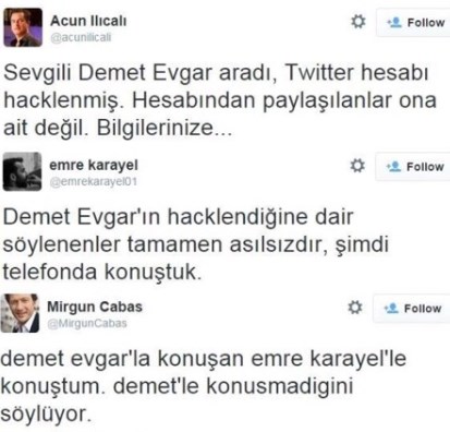 Bu tweetlerin ardından Acun Ilıcalı, tweet attı ve "Sevgili Demet Evgar aradı, Twitter hesabı hacklenmiş. Hesabından paylaşılanlar ona ait değil. Bilgilerinize..." yazdı.