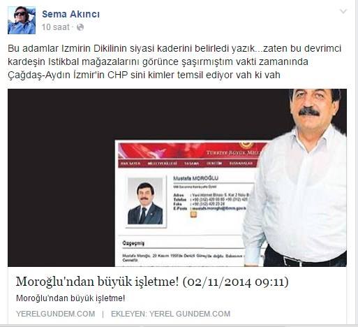 Yerel Gündem sitesinde yer alan "Moroğlu'ndan Büyük İşletme" adlı haberi paylaşan Akıncı, "Bu adamlar İzmir Dikili'nin siyasi kaderini belirledi yazık.. Zaten bu devrimci kardeşin İstikbal Mağazalarını görünce şaşırmıştım vakti zamanında. Çağdaş-Aydın İzmir'in CHP'sini kimler temsil ediyor vah ki vah" dedi.