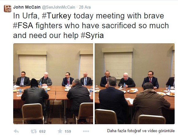 John McCain, Twitter hesabından görüşmeye ilişkin fotoğraflar ve bir de mesaj yayınladı. ÖSO militanlarıyla yapılan toplantının Şanlıurfa'da gerçekleştiği açıklanırken McCain, mesajında ÖSO'nun yardıma ihtiyacı olduğunu öne sürdü.