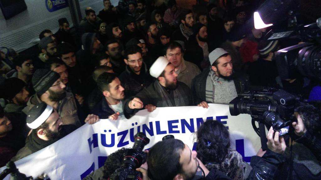Gazete önünde kısa süre oturma eylemi yapan grup, "Kanımız aksa da zafer İslam'ın", "Cumhuriyet Gazetesi hesap verecek", "Burası Türkiye, Fransa değil" şeklinde sloganlar attı.