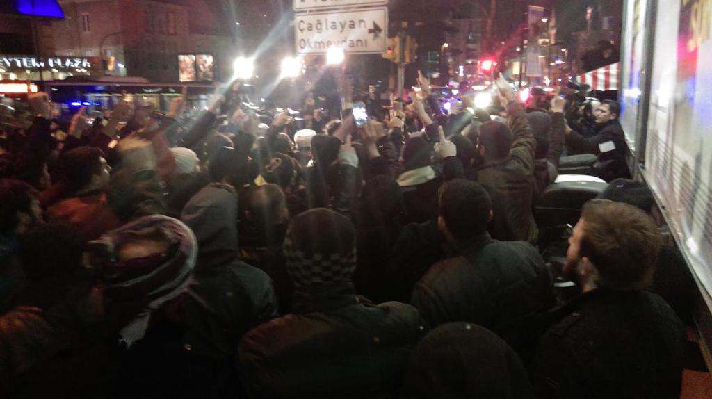 Sosyal medyada Charlie Hebdo mizah dergisinden 4 sayfalık bir seçki yayınlayan Cumhuriyet gazetesine saldırı çağrıları yapılmasının ardından, akşam saatlerinde bir grup gazete önüne gelerek, "Kouachi kardeşler onurumuzdur" sloganları attılar.