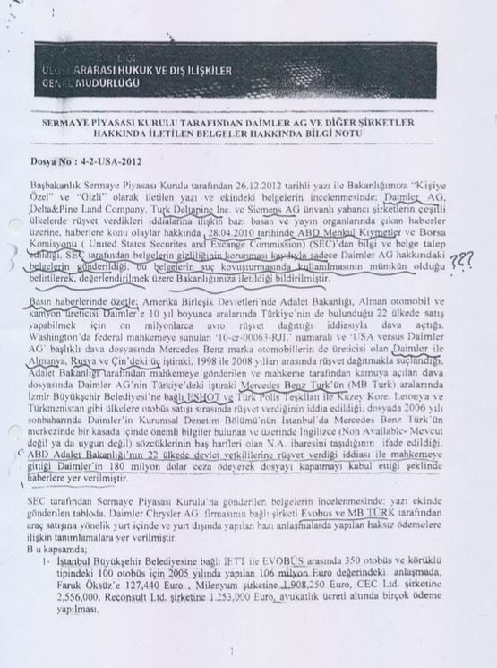 Dünyanın en büyük şirketlerinden biri olan Daimler Benz'in Amerika ve Almanya'da rüşvet vermekle suçlandığını ve şirket merkezinde aramalar yapıldığını kaydeden Erdoğdu, "Şirket kasasında bulunan gizli belgelerde senin gibi adamlara verildiği iddia edilen rüşvetlere ilişkin kayıtlar bulunuyor. Şirket yetkilileri hapis cezası almamak için suçlarını itiraf edip 180 milyon dolar ceza ödüyor. Dünyanın en büyük şirketlerinden birinin itibarı yerle bir oluyor. Yani senin boyunu çok aşan bir mesele var" dedi.