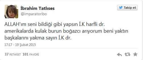 Ünlü şarkıcı İbrahim Tatlıses paylaştığı yazıda; "Allah'ım seni bildiği gibi yapsın İ.K harfli doktor Amerikalarda kulak burun boğazcı arıyorum beni yaktın başkalarını yakma sayın İ.K dr" diyerek doktoruna ateş püskürdü.