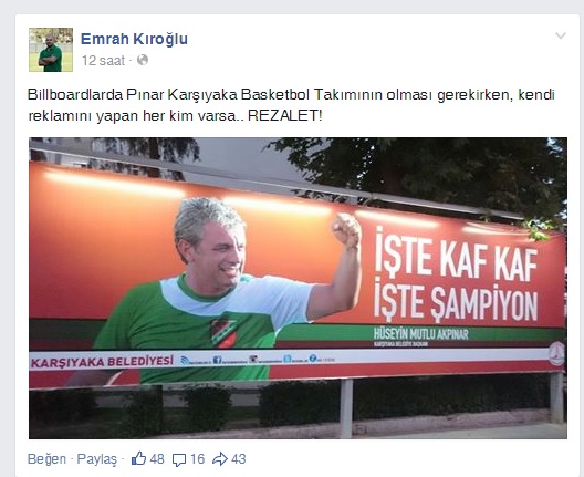 “Billboardlarda Pınar Karşıyaka Basketbol Takımının olması gerekirken, kendi reklamını yapan her kim varsa.. REZALET!”