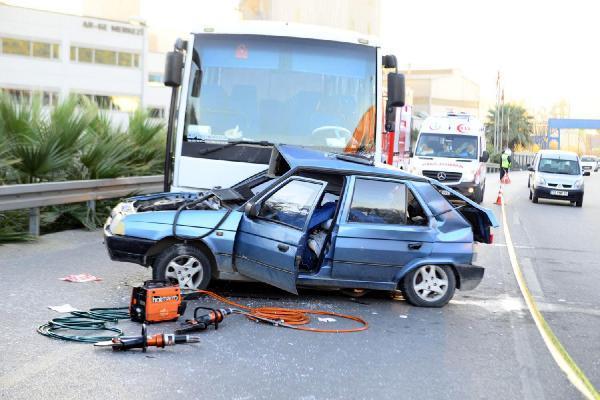 İZMİR'in Kemalpaşa ilçesinde, virajda kontrolden çıkan otomobilin karşıdan gelen servis midibüsüyle çarpıştığı kazada baba ile oğlu öldü, 4 kişi yaralandı.