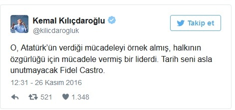 CHP Genel Başkanı Kemal Kılıçdaroğlu, 90 yaşında yaşamını yitiren Küba'nın eski devlet başkanı Fidel Castro için bir mesaj yayınladı.