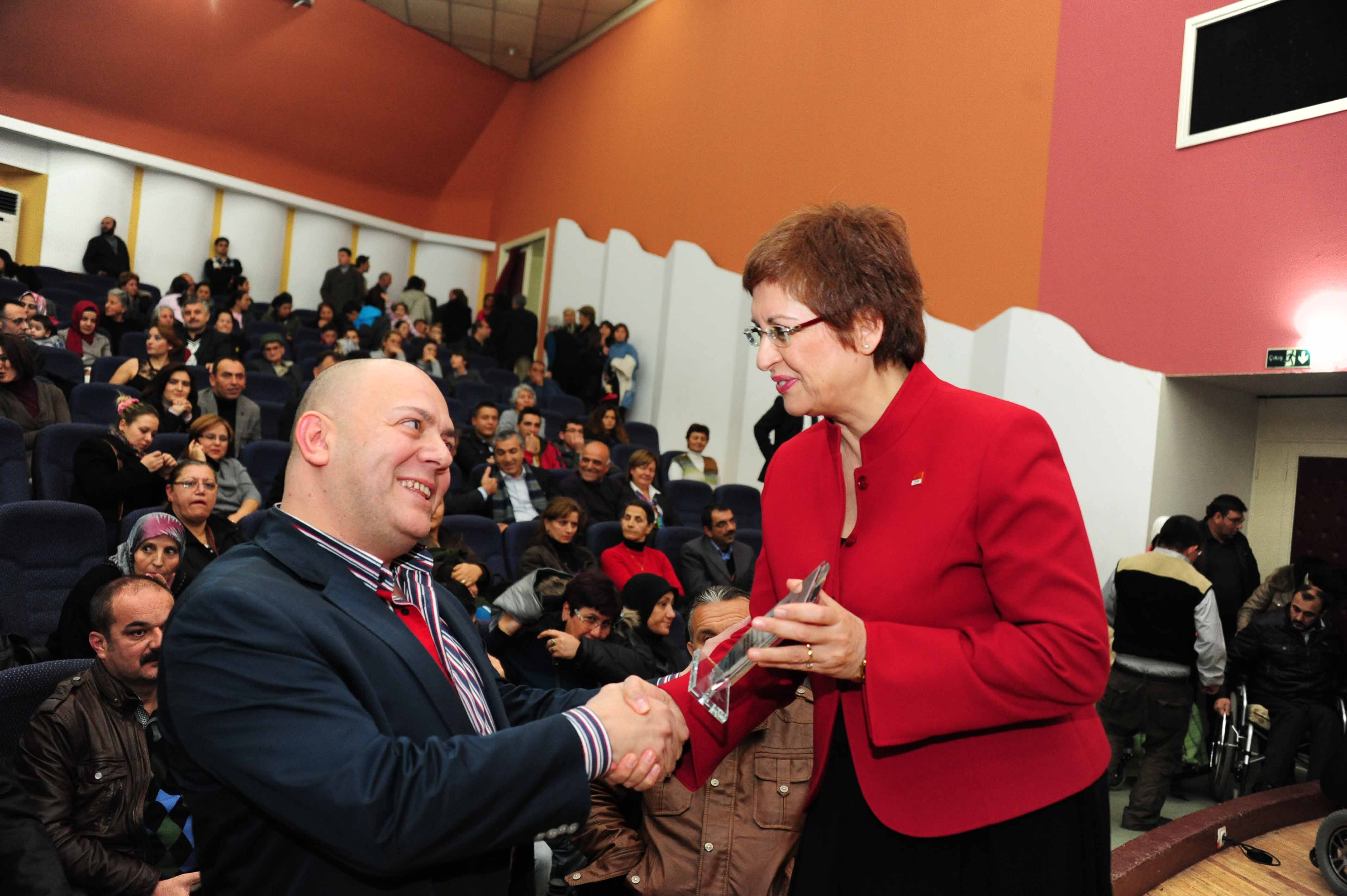İzmir Valiliği Engelliler Merkezi Koordinatörü Rıza Mutkilioğlu’na plaketini takdim eden CHP Genel Başkan Yardımcısı Perihan Sarı, Muharrem Dayanç’ın sosyal sorumluluk projelerinin başarılı sonuçlarını yakından izlediğini belirterek, “Sosyal sorumluluk, başkalarının mutluluğu ve içinde bulunduğu koşulları iyileştirme yönünde bir çaba. Ben CHP’nin sorumlu bir üyesi olarak Muharrem Dayanç’ın bu çabasını değerli ve önemli buluyorum. Engelleri sanatla aşan tüm çocuklarımızı kutluyorum” dedi. Muharrem Dayanç ise, cezaevindeki çocuklar ve engelli çocukların ardından yeni proje hedef kitlesinin lösemili çocuklar olacağını vurguladı. Etkinlik plaket töreni ardından sona erdi.