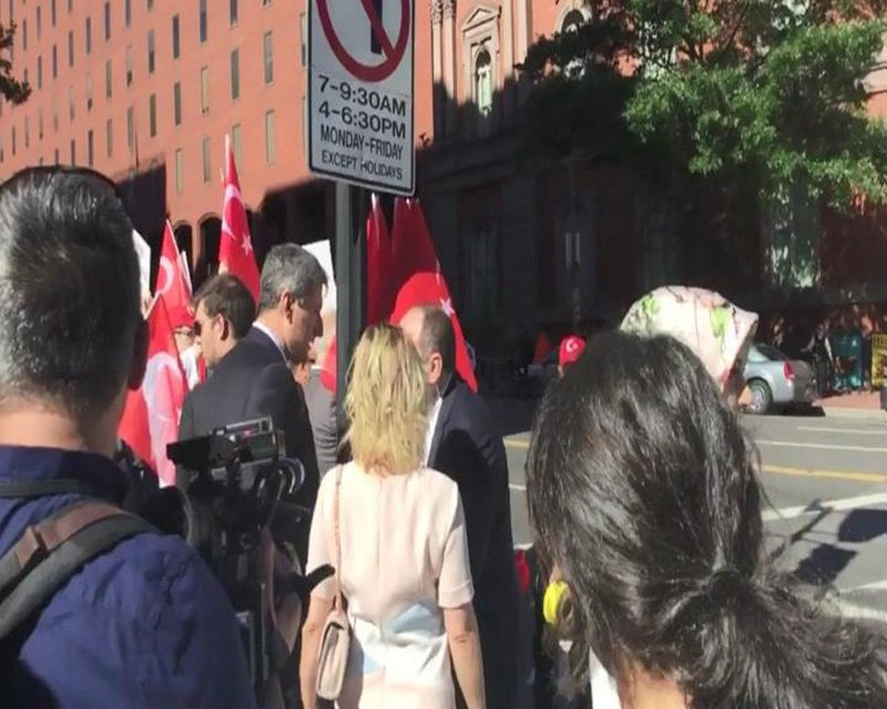 DHA’nın haberine göre; Erdoğan otelde dinlemeye geçerken, otelin yan sokağında toplanan kalabalığa Türkiye’nin Washington Büyükelçisi Serdar Kılıç, hitap etti.