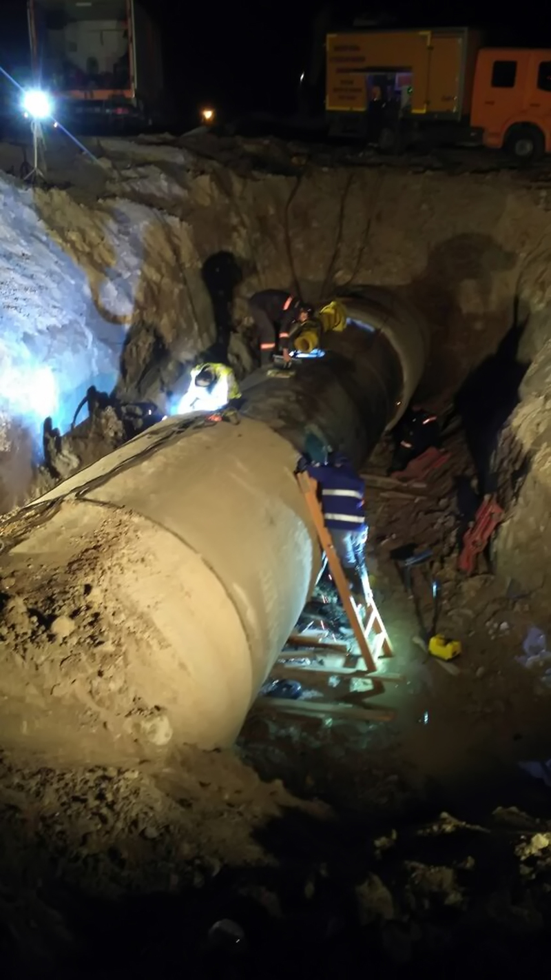 İZSU Genel Müdürlüğü ekipleri, 14 Mayıs Pazar akşamı saat 21.00’de 100 km’lik Tahtalı Barajı ana isale hattında yaşanan ve Buca, Karabağlar ve Gaziemir’de su kesintilerine yol açan arızanın giderilmesi için çalışmalarını aralıksız sürdürüyor. Dün arızalı borunun olduğu noktayı kazarak boruyu çıkaran İZSU ekipleri, gece boyunca da 6 metre uzunluğundaki betonarme borudan çeliğe geçiş parçasını monte etti ve 10 kişilik kaynak ekibiyle 6 metrelik çelik borunun kaynağına başladı. Bir yandan kaynak devam ederken diğer yandan boru içinde kaplama işlemi yapıldığını belirten İZSU Genel Müdürlüğü yetkilileri, bugün öğleden sonra çelik borunun alt tabanına mıcırla dolgu yaparak beton atılacağını, onun kurumasını bekledikten sonra kazılan yerin kapatılacağını belirtti.