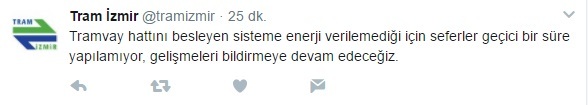 Tram İzmir sosyal medya hesabından Karşıyaka tramvayının geçici bir süre durdurulduğunu açıkladı.