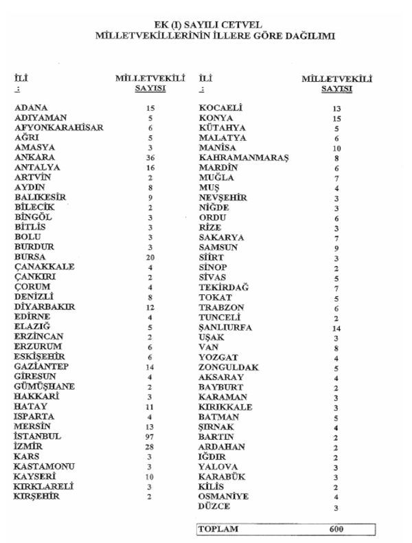 Anayasa değişikliği ile 600'e çıkarılan milletvekili sayısı nedeniyle, illerin çıkaracağı milletvekili sayıları da değişiyor. Resmi Gazete'nin bugünkü sayısında yer alan Yüksek Seçim Kurulu (YSK) kararına göre, illerin çıkaracağı milletvekili sayıları, anayasa değişikliği ile getirilen 600 milletvekili sayısına göre yeniden hesaplandı.