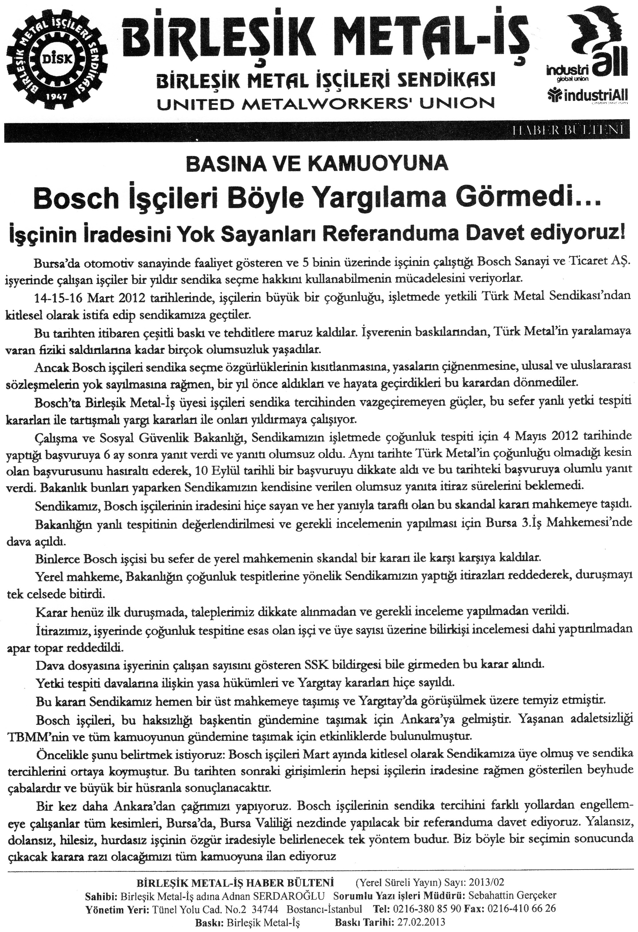 İşçilerden 4 bininin Türk Metal Sendikası'ndan ayrılarak kendi sendikalarına üye olduğunu belirten Serdaroğlu, ''Ancak, Çalışma ve Sosyal Güvenlik Bakanlığı, sendikamızın işletmede çoğunluk tespiti için 4 Mayıs 2012'de yaptığı başvuruya olumsuz yanıt verdi. Aynı tarihte Türk Metal'in çoğunluğu olmadığı kesin olan başvurusunu hasır altı ederek, 10 Eylül tarihli başvuruyu dikkate aldı ve olumlu yanıt verdi. Konuyu yargıya taşıdık ama yerel mahkeme itirazımızı reddederek, duruşmayı tek celsede bitirdi. Sendikamız konuyu Yargıtay'a taşımıştır'' dedi.