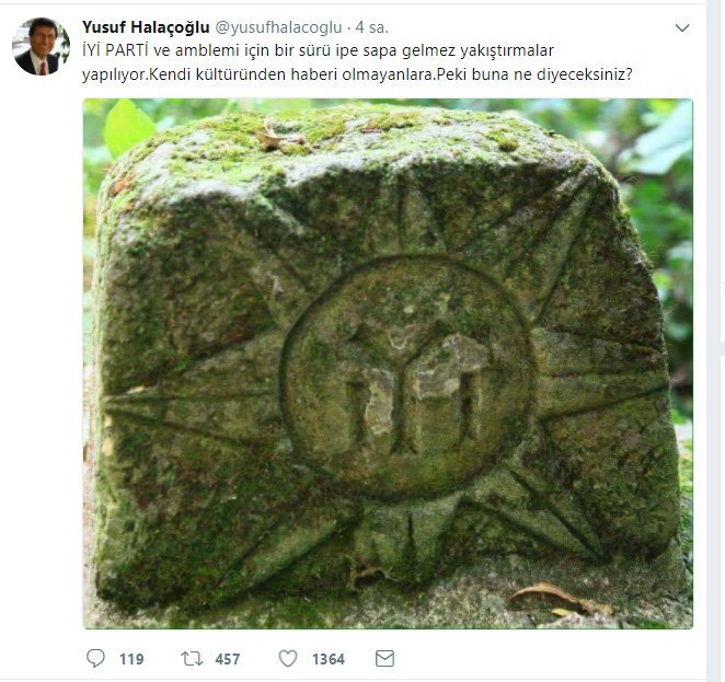 Meral Akşener liderliğinde kurulan yeni partinin önde gelen isimlerinden Kayseri milletvekili Yusuf Halaçoğlu, yeni partinin logosu için yapılan tartışmalara yönelik açıklama yaptı. Üzerinde Kayı Boyu işareti bulunan tarihi bir eserin fotoğrafını paylaşan Halaçoğlu "Kendi kültüründen haberi olmayanlara. Peki buna ne diyeceksiniz?" diye tepki gösterdi.