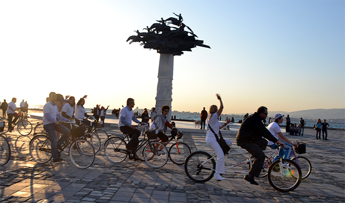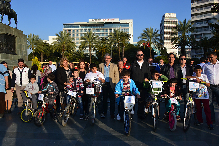 Cumhuriyet Meydanı’ndan başlayan ve Kordon’da devam eden sembolik bisiklet turu Gündoğdu Meydanı’nda son buldu. Etkinliğe katılanlara özel tasarlanmış tshirtler dağıtılırken pedal çevirenleri Gündoğdu Meydanı’nda büyük bir kalabalık karşıladı.