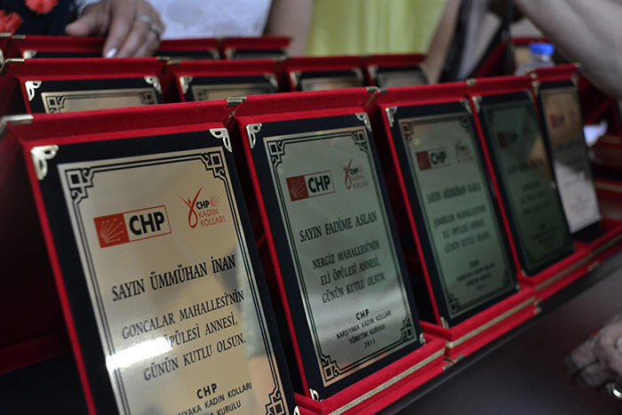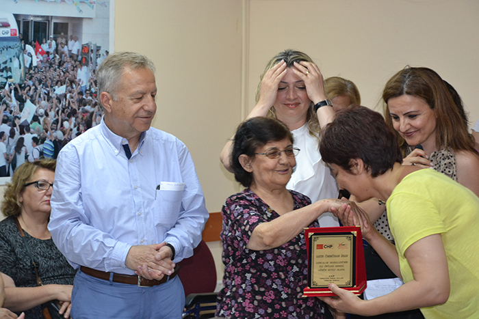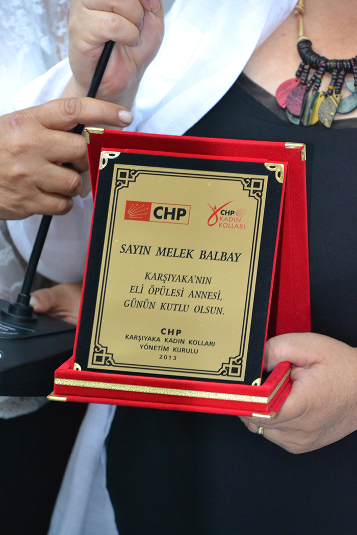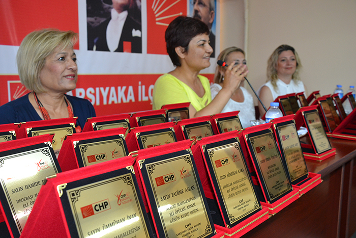 Şehit ve engelli anneleri Aysel Ege, Perihan Karakaya, Remziye Yavuz, Ülker Yılmaz, Şerife Fidan, Çiğdem Bingöl, Hülya Doğantekin, Hatice Ferhan Başkurt, Emine Şahin, Safiye Sert, Hatice Sudurur, Mihriban Kara, Yasemin Liman, Oya Başaran, Ferda Ünlüer, Halime Alp, Hamide Durak, Makbule Dizdaroğlu, Zerrin Aker, Nurten Güngör, Fadime Aslan, Pembe Akçay, Öznur Kayık, Hilal Atis, Münever Ertunga’ya Kadın Kolları yöneticileri tarafından adlarına düzenlenen plaketler takdim edilirken, duygulu anlar da yaşandı. Plaket takdimi sırasında söz alan annelerin ve evlatlarının hayat hikayeleri salonda bulunan kadınlara ve kadın kolları yöneticilerine duygulu anlar yaşattı. Yaklaşık 5 senedir cezaevinde tutuklu bulunan CHP İzmir Milletvekili Mustafa Balbay’ın annesi Melek Balbay’ın isminin anons edilmesi ile birlikte gözyaşları artarken, sıcak hava sebebi ile programa katılamayan anne Balbay’ın ödülünü ise kendisine teslim etmek üzere “Balbay Grubu” temsilcileri teslim aldı. Tören salonda bulunan katılımcıların ve ödül alan annelerin hep birlikte okuduğu “Karşıyaka Andı” ile son buldu.