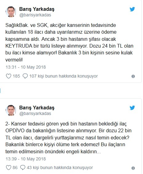 CHP İstanbul Milletvekili Barış Yarkadaş, binlerce hastanın tedavisinde kullanılan Keytruda e Opdivo ilaçlarının listeye alınmamasını eleştirdi.
