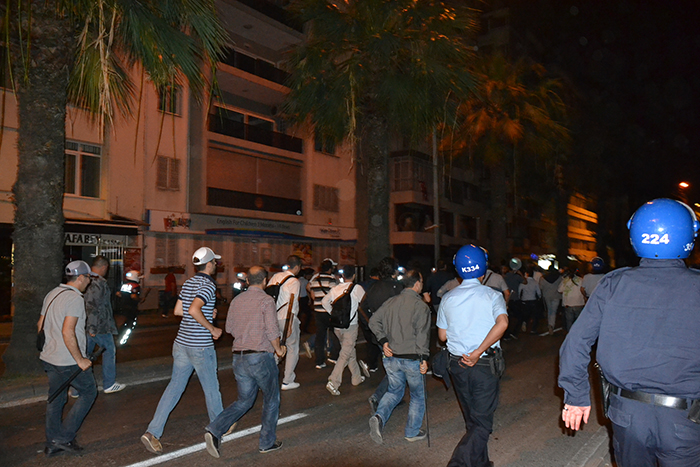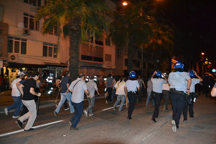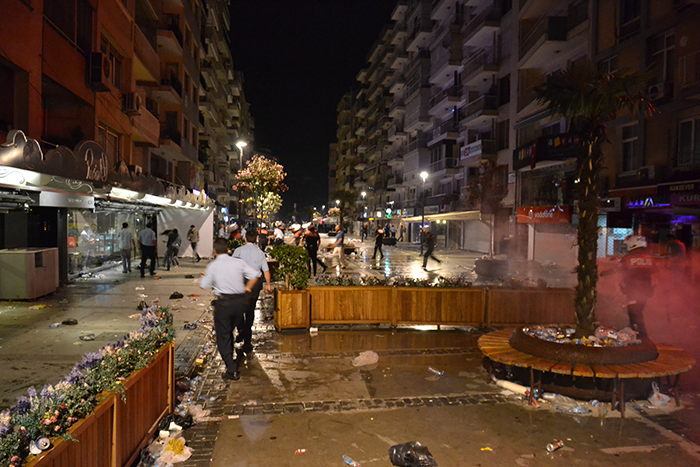 Talat Paşa Bulvarı’nı trafiğe kapatarak bekleyen kalabalığı dağıtmak isteyen emniyet güçleri, ‘en sert şekilde müdahale ediyoruz, limandan denize döküyoruz’ emriyle direnişçilere doğru hareket etti. Görüntülerde en dikkat çekici olansa TOMA’ların arkasında bulunan çevik kuvvet güçlerine destek veren eli tahta ve demir sopalı ‘Sivil Polis’ler oldu. 31 Mayıs’ın aksine daha sert müdahale eden güvenlik güçleri birçok genci gaza boğdu, elindeki sopalarla ara sokaklarda kovaladı.