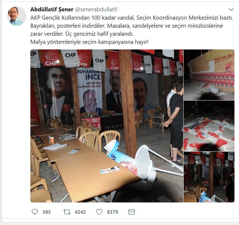 Konuyla ilgili sosyal medya hesabından bir açıklama yapan Şener, “AKP Gençlik Kollarından 100 kadar vandal, Seçim Koordinasyon Merkezimizi bastı. Bayrakları, posterleri indirdiler. Masalara, sandalyelere ve seçim minübüslerine zarar verdiler. Üç gencimiz hafif yaralandı. Mafya yöntemleriyle seçim kampanyasına hayır!” dedi.