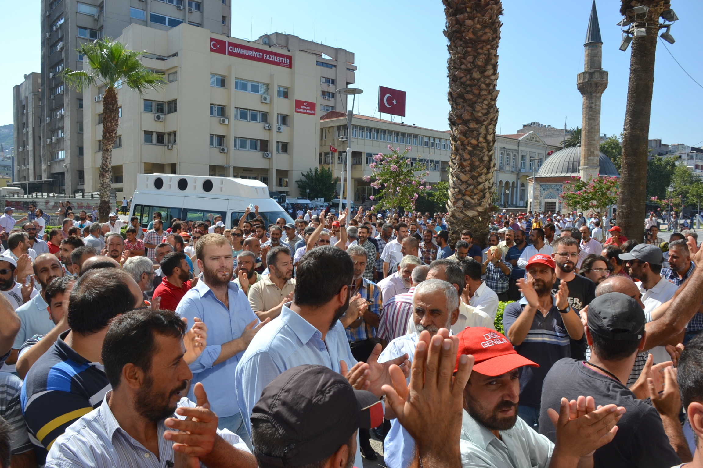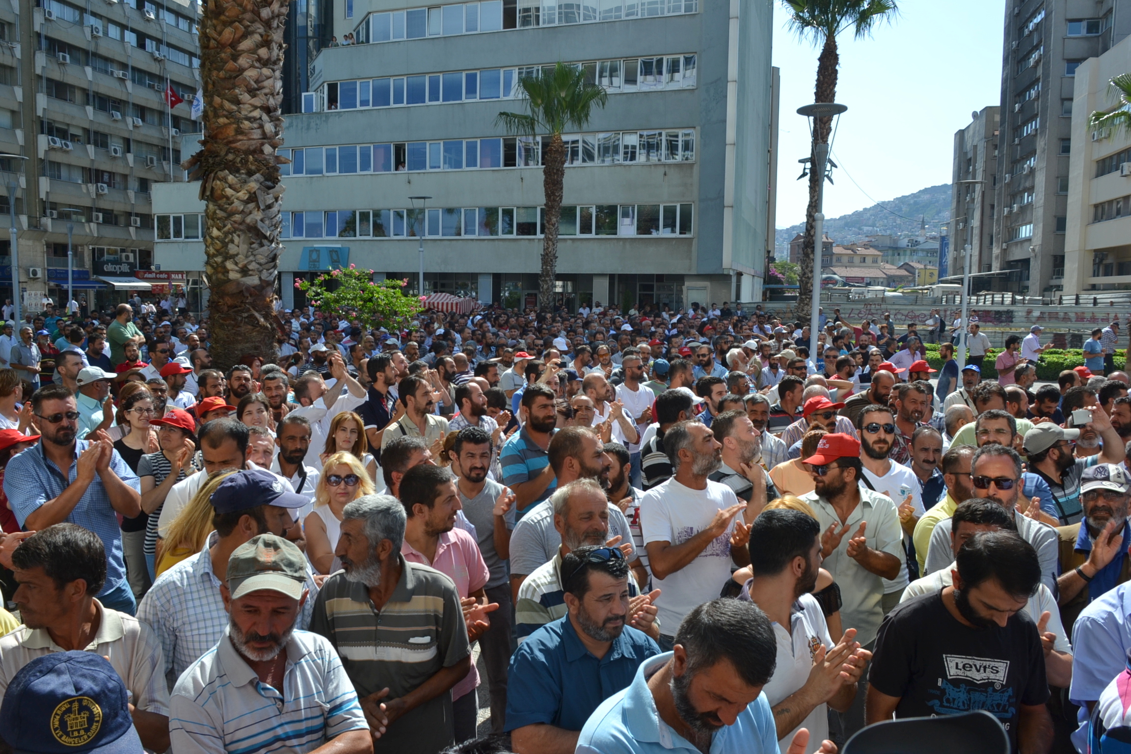 Sözleşmelerin grevle değil, masa başında bitmesinden yana olduklarını yineleyen DİSK Ege Bölge Temsilcisi ve Genel-İş 3 No’lu Şube Başkanı Memiş Sarı konuşmasında şunları kaydetti: ‘’Bu çağrımızı defalardır yineliyoruz da. Dün akşamüzeri İzmir Büyükşehir Belediyesi Genel Sekreteri Pervin Şenel Genç’ten bir davet adlık ve gelin görüşmelere yeniden başlayalım dendi. Biz bir tarafız ve bu davete icap etmek zorundayız. Akşam saat 7’de bu görüşmeye girdik ve gece geç saatlere kadar da sürdü. Ankara’dan Cafer Başkan’ımız ve 3 şube başkanı olarak görüşmedeydik. Bugün için geçtiğimiz Cuma gününden almış olduğumuz bir eylem kararı vardı. Burada işvereninin de bir eksikliği vardı. Bize daha önceden denmiş olsaydı biz bugün bu eyleme çıkmazdık. Görüşme başladı, karşılıklı adımlar atıldı ve kısmen de olsa bazı gelişmeler sağlandı. Sonra üç şube başkanı olarak taleplerimizi ilettik. Pervin Hanım, Başkan Kocaoğlu’na taleplerimizi ileteceğini dile getirdi. Kocaoğlu’ndan alınacak son talimatlar doğrultusunda da tekrar masaya oturup toplu sözleşmeyi bitirmek için gereken gayreti göstereceğiz dendi. Görüşmelerin olduğu zamanlarda eylem kararları uygulanmayabilir. Bu bir geri çekilme değildir. Sadece açılan kapıdan içeri girmektir. Çünkü biz burada 10 bin üyenin sorumluluğunu taşıyoruz. Biz arkadaşlarımızın insanca yaşayabileceği bir hayat için ücret talep ediyoruz. Sosyal haklarda gereken iyileştirmeler geldiği takdirde neden bu sözleşmeleri imzalamayalım, neden bu görüşmeler masa başında bitmesin? Süreci germeye gerek yok. Bugün her şey daha da netleşecek. Bugün yapacağımız görüşmelerde, İzmir Büyükşehir Belediyesi tarafından istediğimiz koşullar masaya konursa grev kararını da uygulamayacağız. Aksi takdirde Cuma günü gece 4’te grev uygulamasını 3 şube olarak hayata geçireceğiz.’’