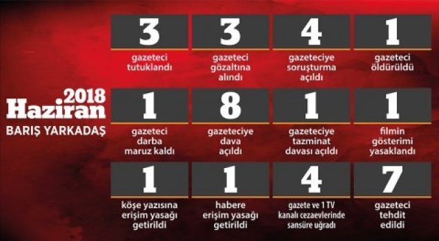 Medya çalışanlarının Haziran ayında da çok çeşitli baskılarla karşı karşıya kaldığını belirten Yarkadaş, "24 Haziran seçim süreci, baskıları daha da artırdı" dedi. Yarkadaş, Haziran ayında yaşanan baskıları ise şöyle özetledi: