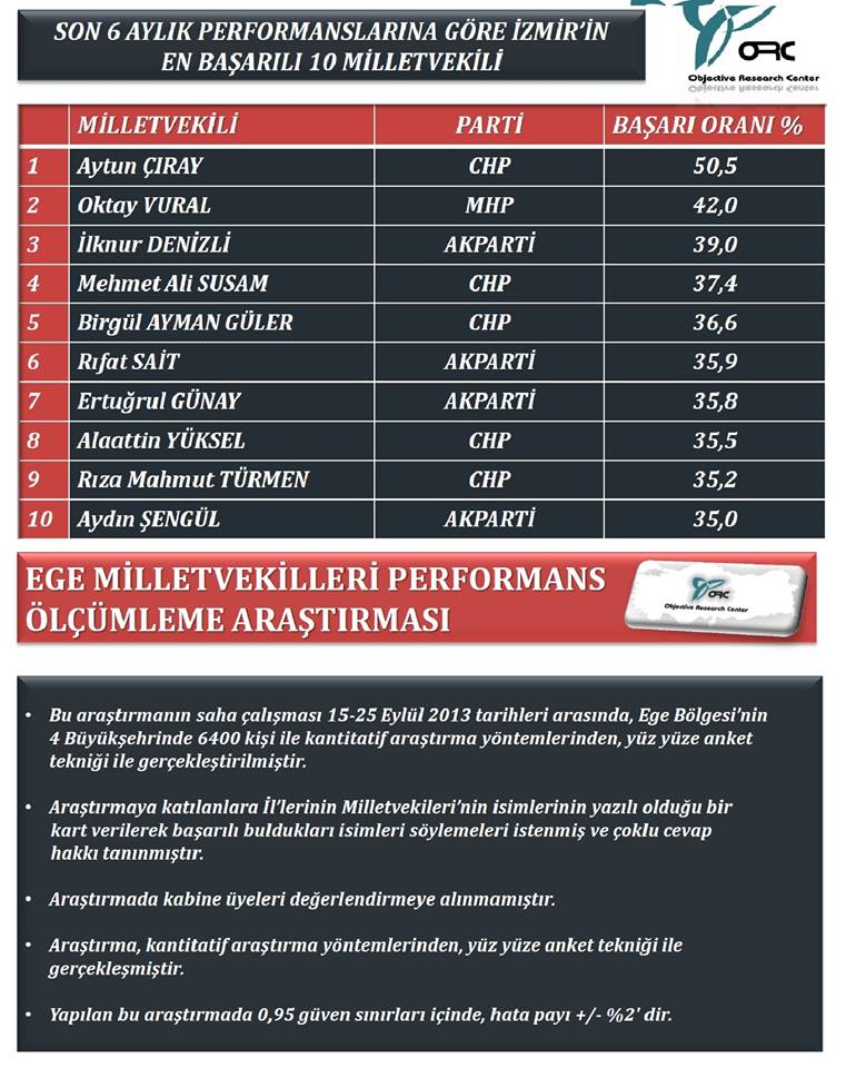 Ege'nin Sesi-Ali Arda PERK/ Objective Research Center (ORC) Araştırma şirketi tarafından yapılan Ege Milletvekilleri Performans Ölçümleri araştırmasında Cumhuriyet Halk Partili (CHP) Dr. Aytun Çıray yüzde 50.5 başarı oranı ile birinci sırada yer aldı.