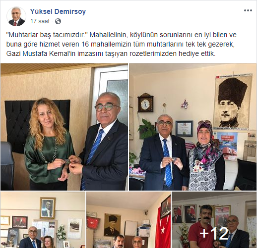“Muhtarlar baş tacımızdır, mahallelinin, köylünün sorunlarını en iyi bilen ve buna göre hizmet veren 16 mahallemizin tüm muhtarlarını tek tek gezerek, Gazi Mustafa Kemal'in imzasını taşıyan rozetlerimizden hediye ettik.”