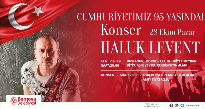 Cumhuriyetin 95’inci kuruluş yıl dönümü Bornova Belediyesi tarafından hazırlanan program kapsamında coşku, birlik ve beraberlik içinde kutlanacak. Bu yıl 2 gün sürecek olan kutlamaların ilk gününde ünlü şarkıcı Haluk Levent Bornova Aşık Veysel Rekreasyon Alanı Amfi Tiyatro’da Bornovalılar ile buluşacak. Etkinlikler kapsamında Fener alayı, Rahvan At Yarışları Cumhuriyet Koşusu, Şeref Yürüyüşü ve Çocuk Senfoni Orkestrası konseri de gerçekleşecek.