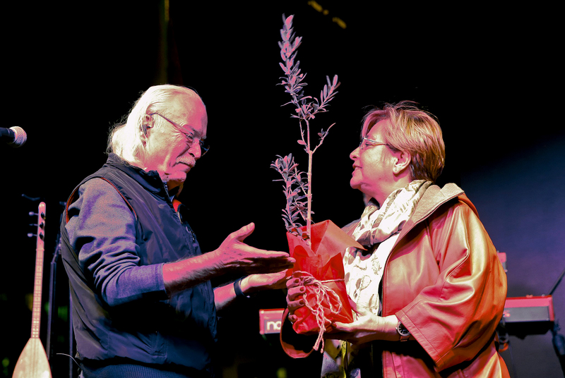 Herkesin 29 Ekim Cumhuriyet Bayramı’nı kutlayan Başkan Pekdaş, sözlerini Mustafa Kemal Atatürk ve Cumhuriyet mücadelesi vermiş değerlere teşekkür ederek sürdürdü. Pekdaş, hukukun, demokrasinin, laikliğin, insan haklarının, çevre haklarının korunması için hep birlikte mücadeleye devam etmek gerektiğini sözlerine ekledi. Konuşmasının sonunda Moğollar grubuna sanattaki 50. yılları anısına zeytin ağacı fidanı hediye eden Pekdaş, “Zeytin ağacı gibi ölümsüz olun” diyerek teşekkürlerini sundu. Cahit Berkay da sahnede aldığı hediyeler içinde en ilginci ve en muhteşemi olduğunu belirterek teşekkür etti.