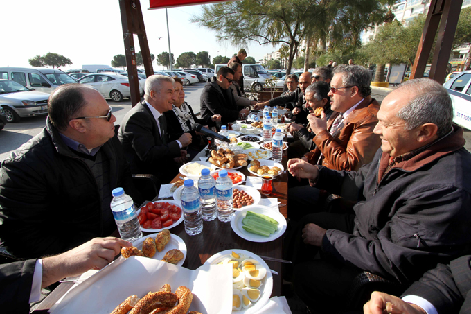 Kendisine teşekkür etmek isteyen Karşıyaka-Mavişehir hattında çalışan taksi dolmuşçuların davetini kırmayan Başkan Durak, gevrek-peynirli kahvaltı sürprizi ile karşılandı. Karşıyaka Vapur İskelesi yanındaki durakta taksi dolmuşçularla kahvaltı yapan Başkan Durak, tramvay projesinin taksi dolmuşlara zarar vermemesi için de çalışma yaptıklarını söyledi. Bir projeyi hayata geçirirken, bölgede yaşayanların bundan zarar görmemesine özen gösterdiklerini vurgulayan Başkan Durak, “Alaybey’den başlayıp Mavişehir’e kadar uzanacak tramvay projesi Büyükşehir Belediyemiz tarafından hazırlandı, ihale aşamasına geldi. Tramvay başladığında sahilde ulaşım çok kolaylaşacak. Bu hattın açılması sonrası aynı hatta çalışan taksi dolmuşlarımızın zarar görmemesi için de proje hazırladık. Farklı hatlar devreye koyarak zarar görmeniz önlenecek “ dedi.