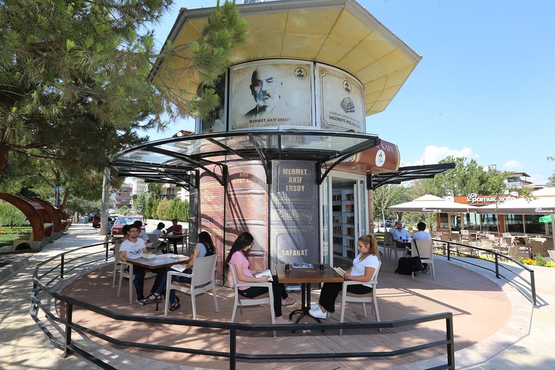 Pamukkale Belediyesi’nin gençlik projelerinden biri olan ve 2 bin seçkin yazardan 3 bin adet seçkin kitap bulunduğu Pamuk Kafe Üniversite ve Kitap Kafe’nin bahçesinde ayrıca 9 adet konuşan bankta bulunuyor. Gençler, kitap okumanın zevkini Kitap Kafe’de çıkartırken, Konuşan banklarda, Necip Fazıl Kısakürek, Mehmet Akif Ersoy, Adil Erdem Bayazıt, Cahit Zarifoğlu, Arif Nihat Asya, Mevlana, Yunus Emre, Nazım Hikmet, Sezai Karakoç’un şiirlerini dinleyerek yorgunluk atıyor.