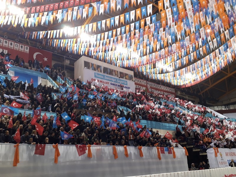 Salona asılan pankartlarda Cumhurbaşkanı Erdoğan'ın yer aldığı "İzmir'in efeleri Reis'i ile 2023'e yürüyor" ile İzmir Büyükşehir adayı Nihat Zeybekci'nin fotoğrafının yer aldığı "Gönüller yapmaya geldik" yazıları yazıldı.