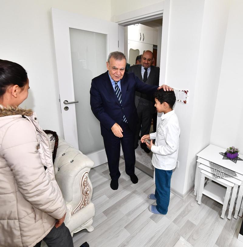 İzmir Büyükşehir Belediyesi'nin ilk kentsel dönüşüm projesi olan Uzundere 1. Etap'taki yeni evleri ziyaret eden Başkan Aziz Kocaoğlu, Meliha-Yusuf Meydan çiftinin konuğu oldu. Aynı apartmandaki komşuların da katıldığı buluşmada Başkan Kocaoğlu çocuklarla da bol bol şakalaştı.