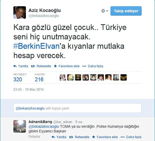 Ege’nin Sesi-Ayten BODUR/ Türkiye’yi yasa boğan Berkin Elvan’ın ölüm haberinin ardından, Başkan Kocaoğlu sosyal medya hesabından ‘Berkin Elvan’a kıyanlar mutlaka hesap verecek’ yazarken, bu akşam düzenlenecek olan eyleme katılacağını da duyurdu. İzmirli vatandaşlar ise Kocaoğlu’nun bu açıklamalarına sert tepki gösterdi.