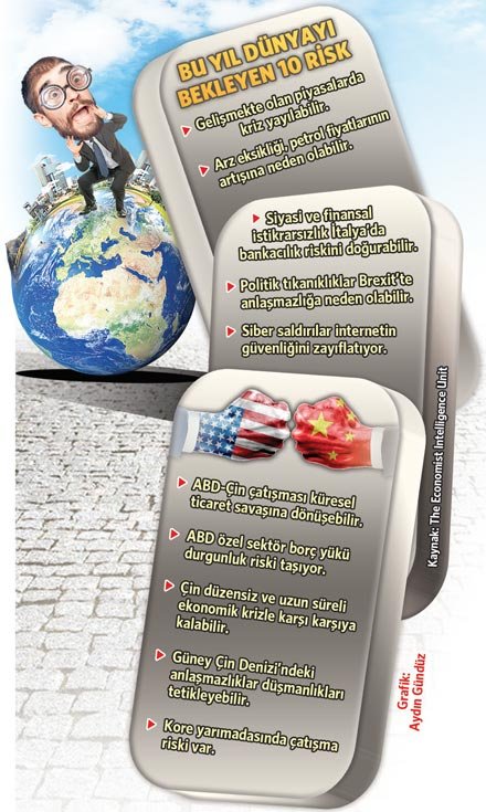 İngiltere merkezli The Economist yayın organının araştırma birimi Intelligence Unit, 2019'un en riskli 10 konusunu belirledi. ABD ve Çin arasındaki ticaret savaşının en riskli sorun olduğunun vurgulandığı raporda, ülke liderlerinin popülist söylemlerinin de tehlike yarattığına dikkat çekildi. Raporda dünya ekonomisinin 2018'de ortalama yüzde 2.9, 2019'da yüzde 2.8 ve 2020'de yüzde 2.6 büyüyeceği ifade edilirken, mevcut riskler nedeniyle bu tahminlerin gerileyebileceği aktarıldı. Raporda, Türkiye'nin ve diğer gelişmekte olan ülkelerin kırılgan ekonomileri de riskler arasında yer aldı.