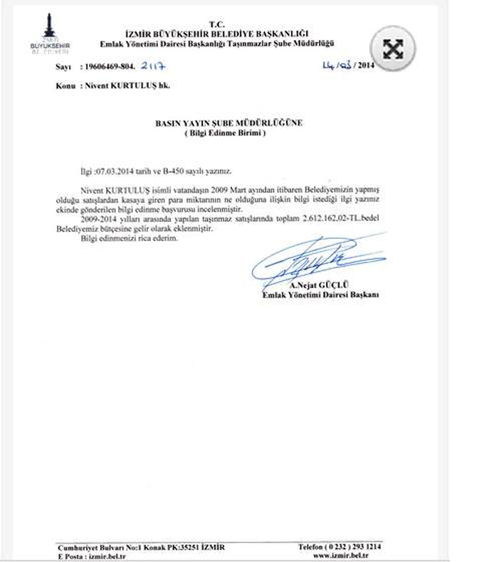 “Nivent Kurtuluş isimli vatandaşın 2009 Mart ayından itibaren Belediyemizin yapmış olduğu satışlardan kasaya giren para miktarının ne olduğuna ilişkin bilgi istediği ilgi yazınız ekinde gönderilen bilgi edinme başvurusu incelenmiştir. 2009-2014 yılları arasında yapılan taşınmaz satışlarında toplam 2.612.162.02.TL bedel belediyemiz bütçesine gelir olarak eklenmiştir. Bilgi edinilmesini rica ederim."
